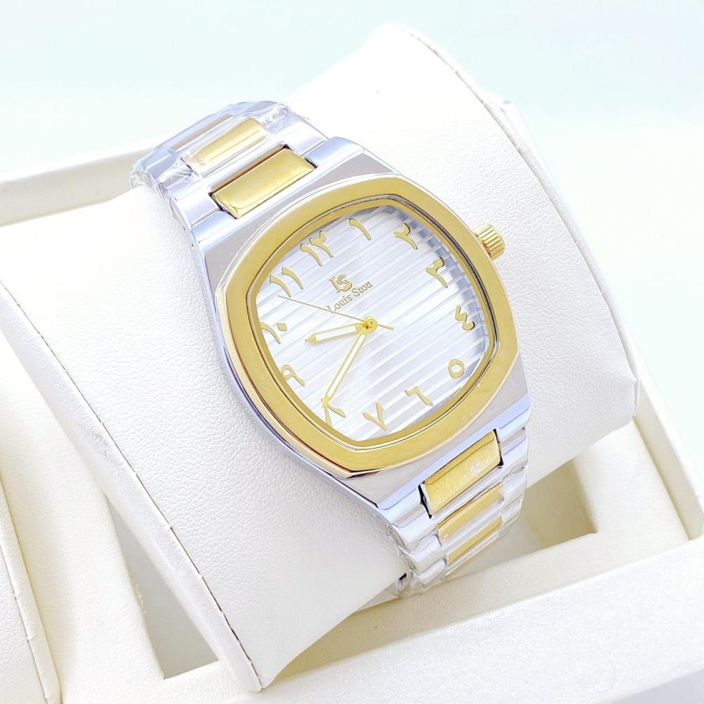 ساعة رجالية بسير و اطار فضي و ذهبي ميناء فضي