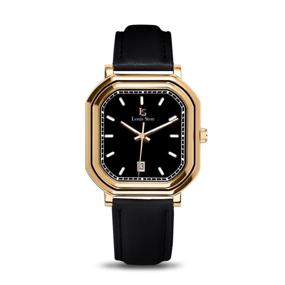 ساعة رجالية جلد سير اسود اطار ذهبي ميناء اسود