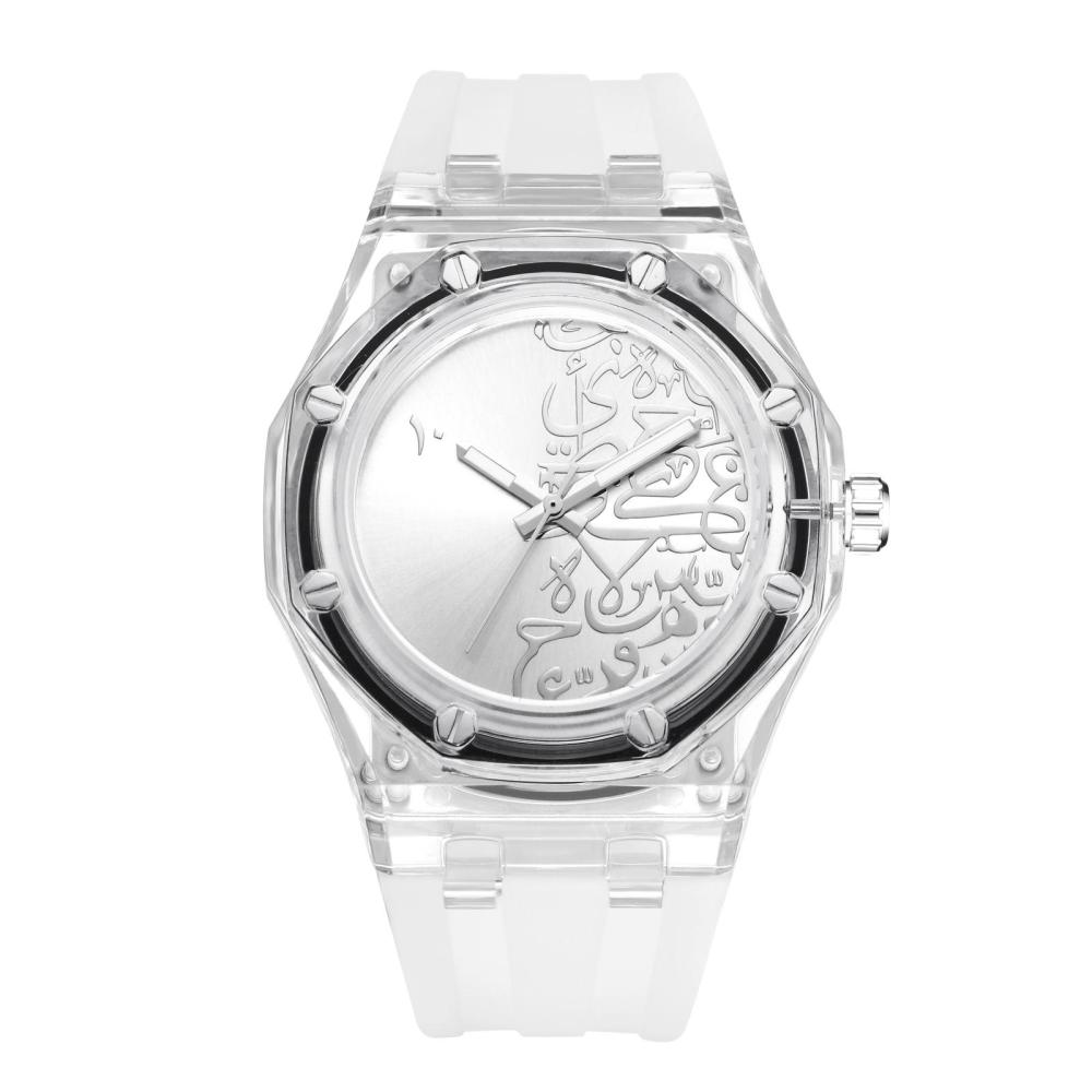 ساعة رجالية ربل ابيض اطار شفاف بنقوش عربية
