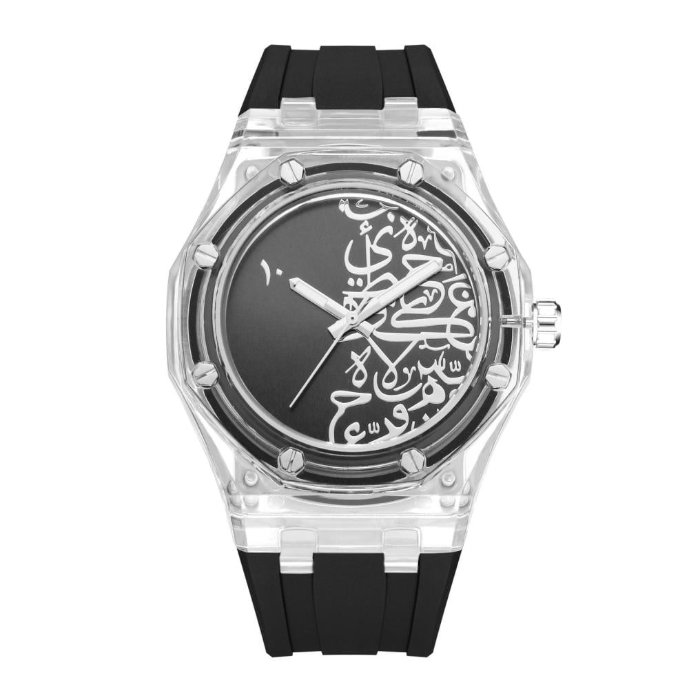 ساعة رجالية ربل اسود اطار شفاف بنقوش عربية