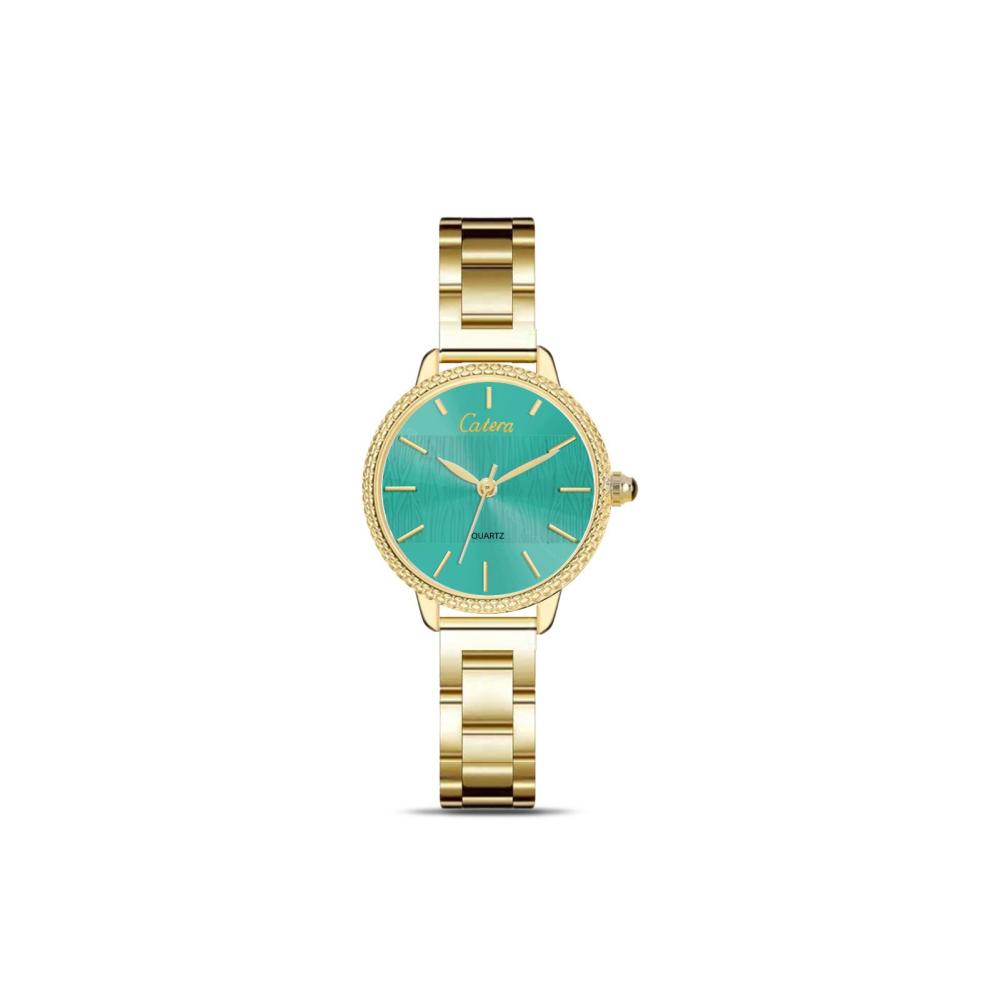 ساعة نسائية سير و اطار ذهبي ميناء اخضر
